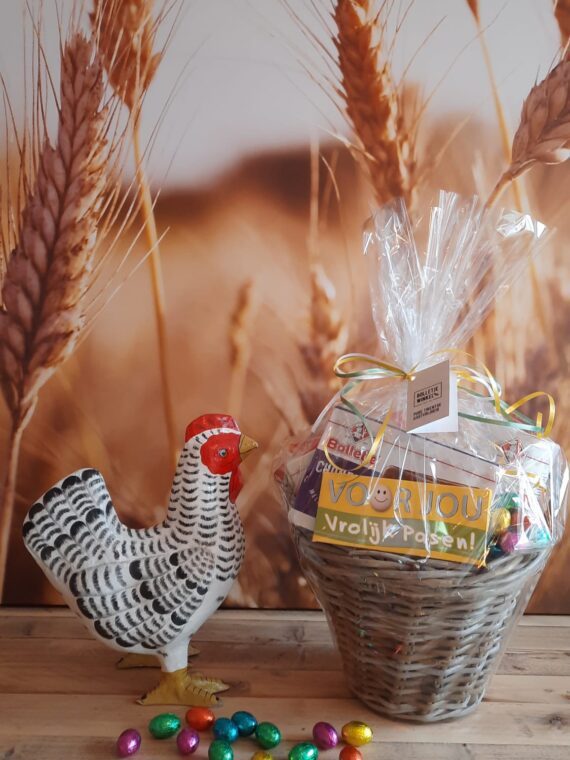 Bolletje picknickmand groot met ontbijtkoek, beschuit, diverse crackers, brosse eierkoek, schuddebuikjes, Goed Bezig graanrepen, 2 soorten Pepsels en Chonelly’s (Kanelly’s, Kokonelly’s of Karamelly’s)