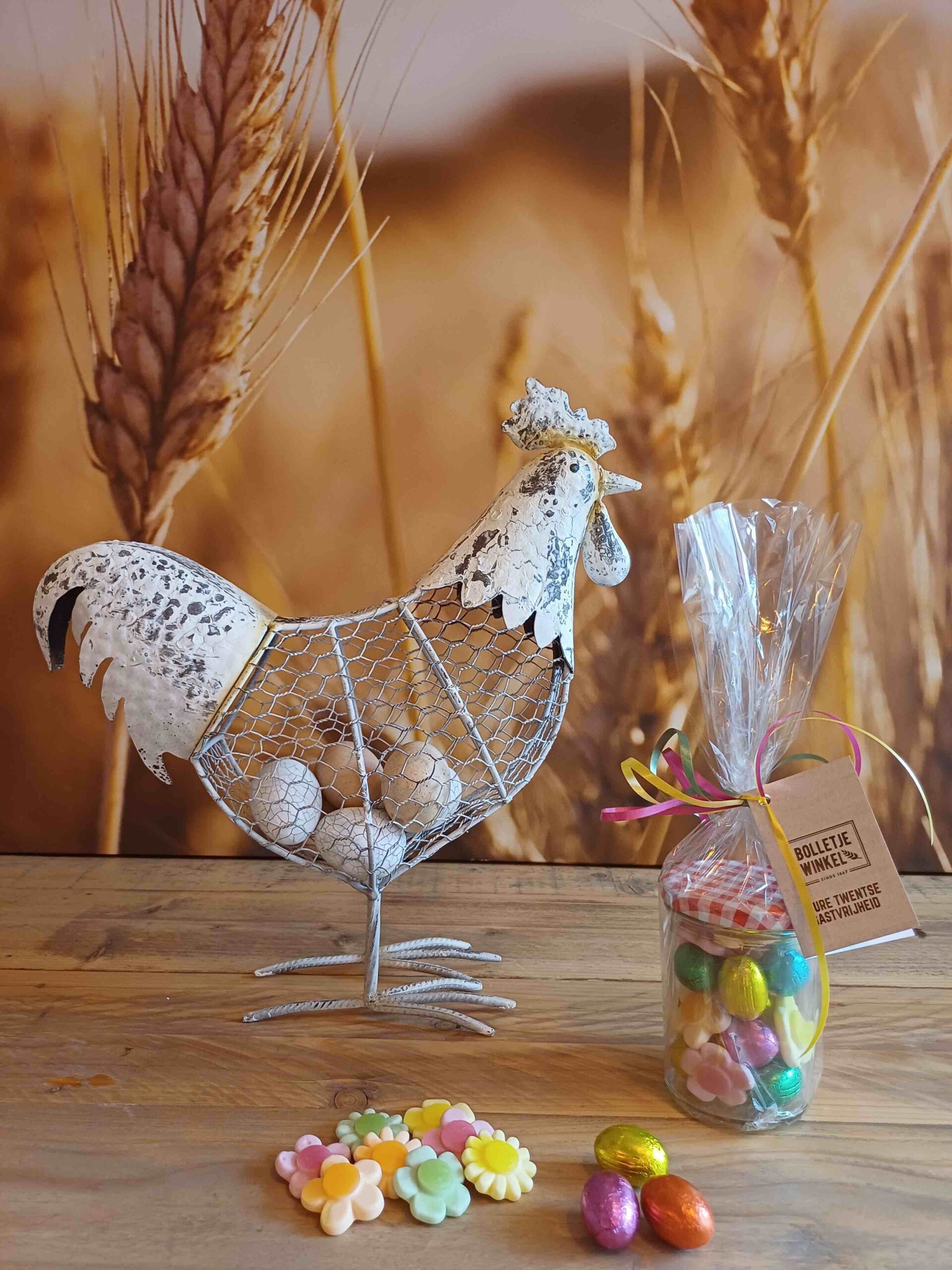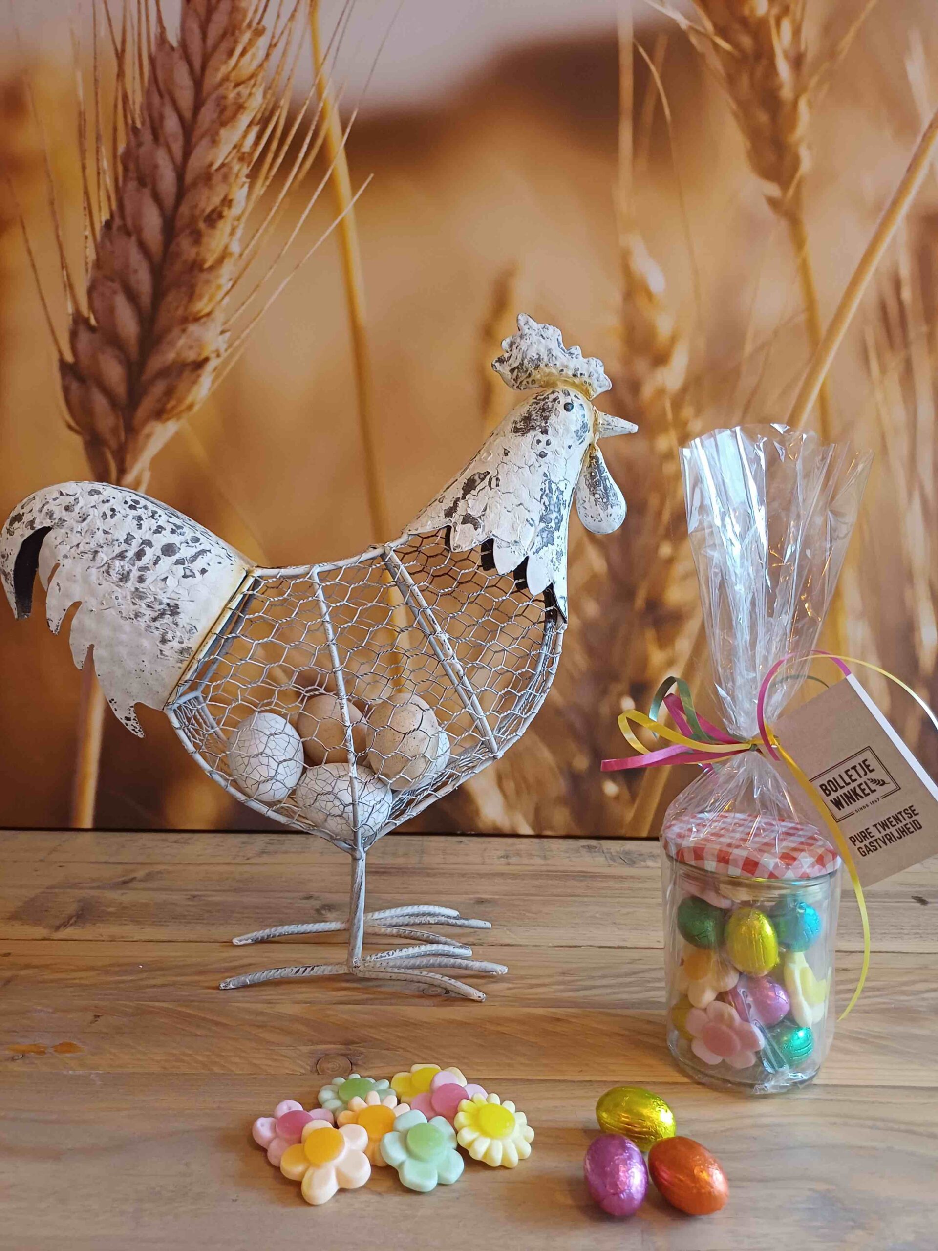 Met vrolijke rood / witte deksel gevuld met heerlijke hazelnootpraliné eitjes en zoete voorjaarsbloemen