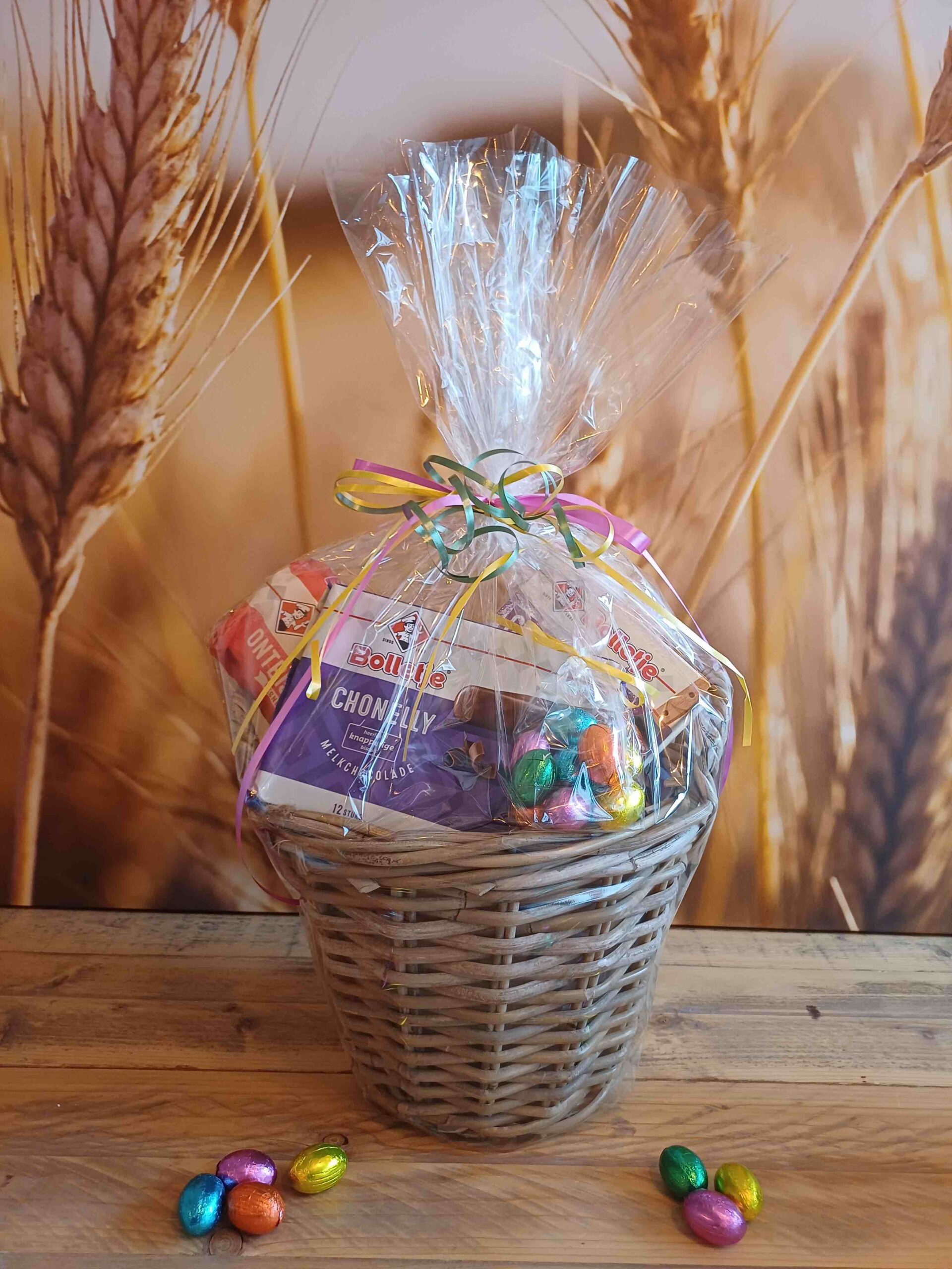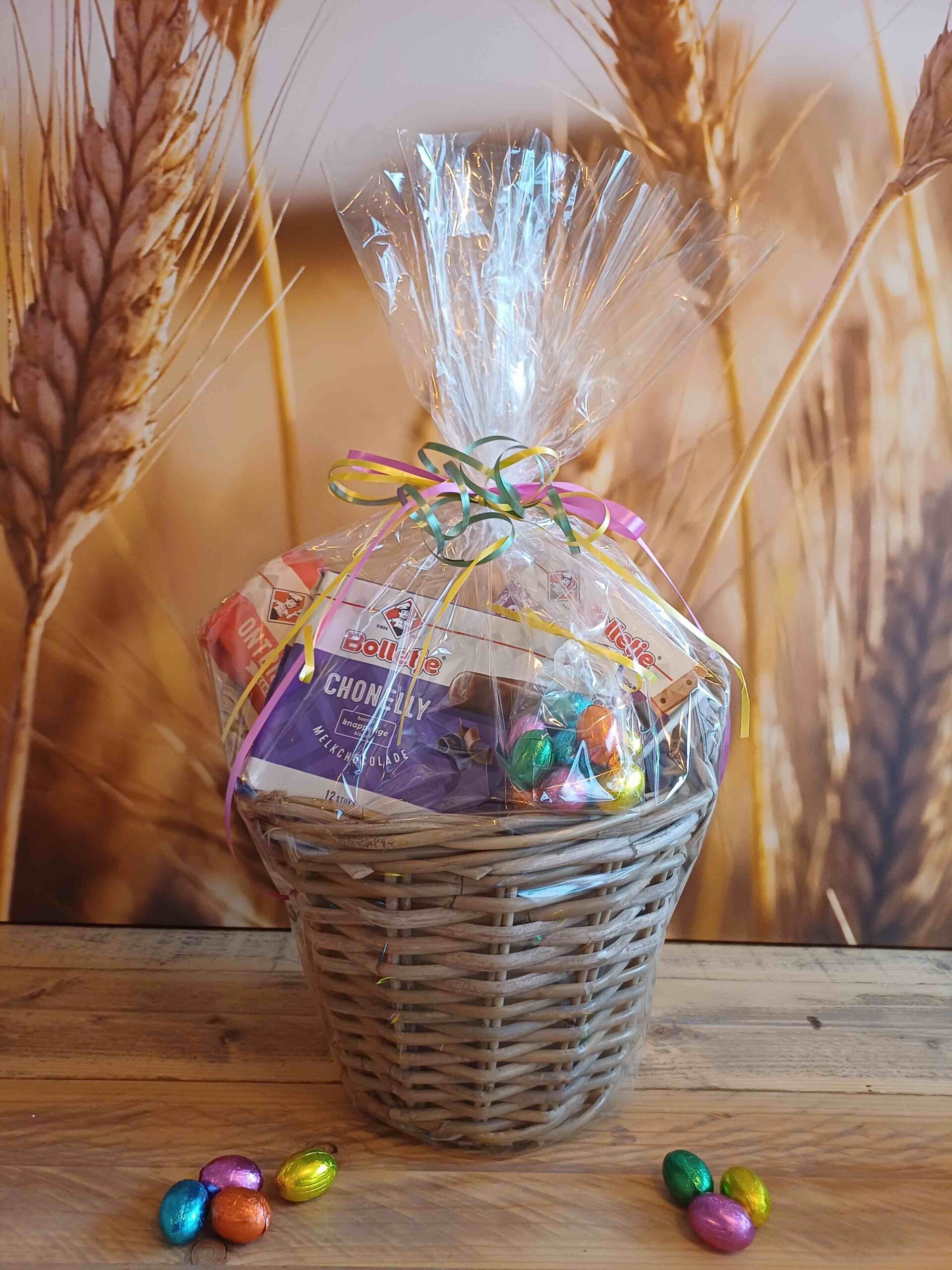 Gevuld met beschuit, crackers, ontbijtkoek, brosse eierkoek, goed bezig graanrepen, zoute pepsels, chonelly’s en een zakje met 10 hazelnootpraliné eitjes