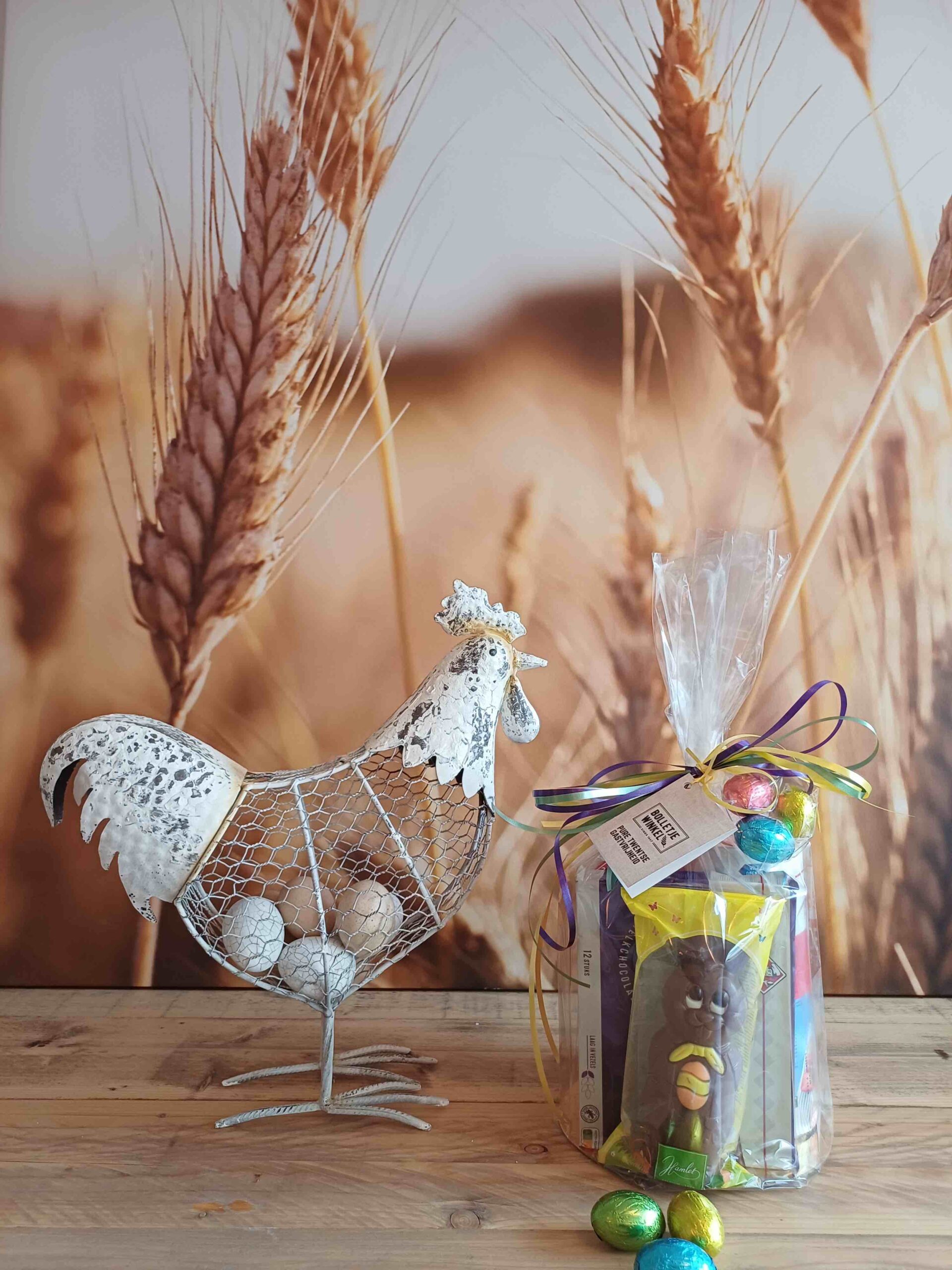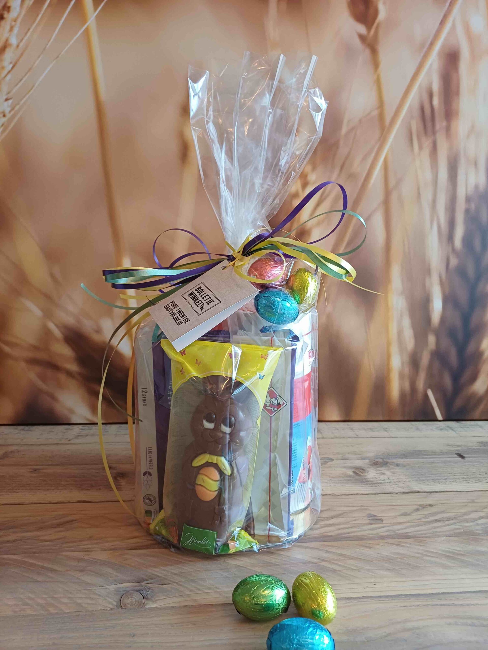 Gevuld met beschuit, schuddebuikjes, zoute pepsels, chonelly’s en een luxe chocolade paashaas